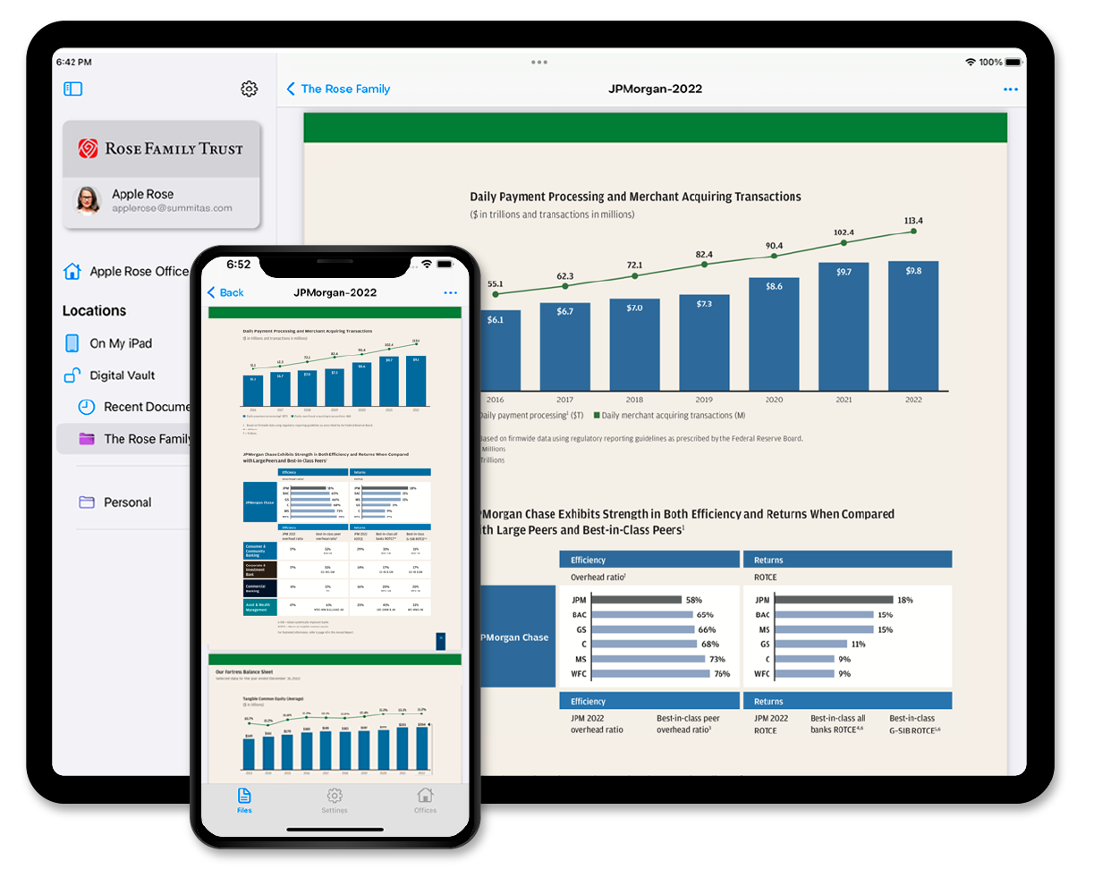 Designed specifically for Summitas Digital Vault™, enjoy access to your most sensitive information from your iOS mobile devices with custom features, such as offline access and integration with Apple Touch ID®, Face ID®, Photos, Files, and other iOS services.