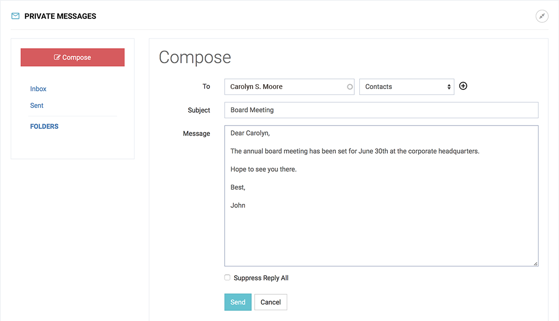 Ensure privacy and security with always-encrypted intrasite messaging — for one or more recipients, including everyone in the portal or a particular office.